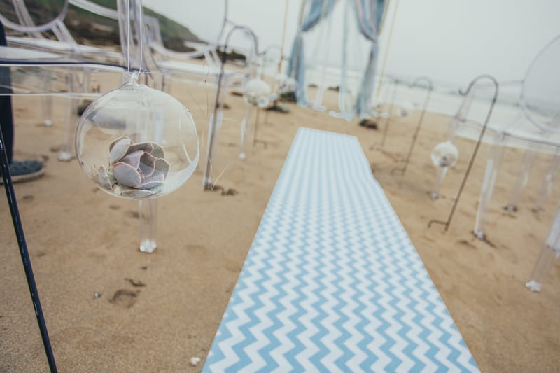 I made a flowing ribbon backdrop for our seaside couple, which fluttered in the sea breeze. The sandy aisle had an aqua chevron fabric runner and was lined with pretty little glass baubles filled with succulent plants. The ghost chairs just melted into the coastal scene.