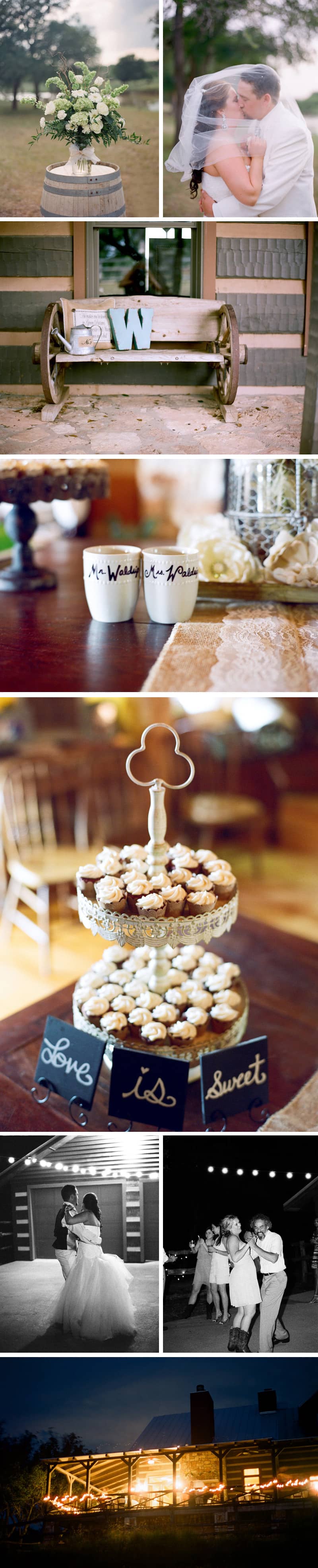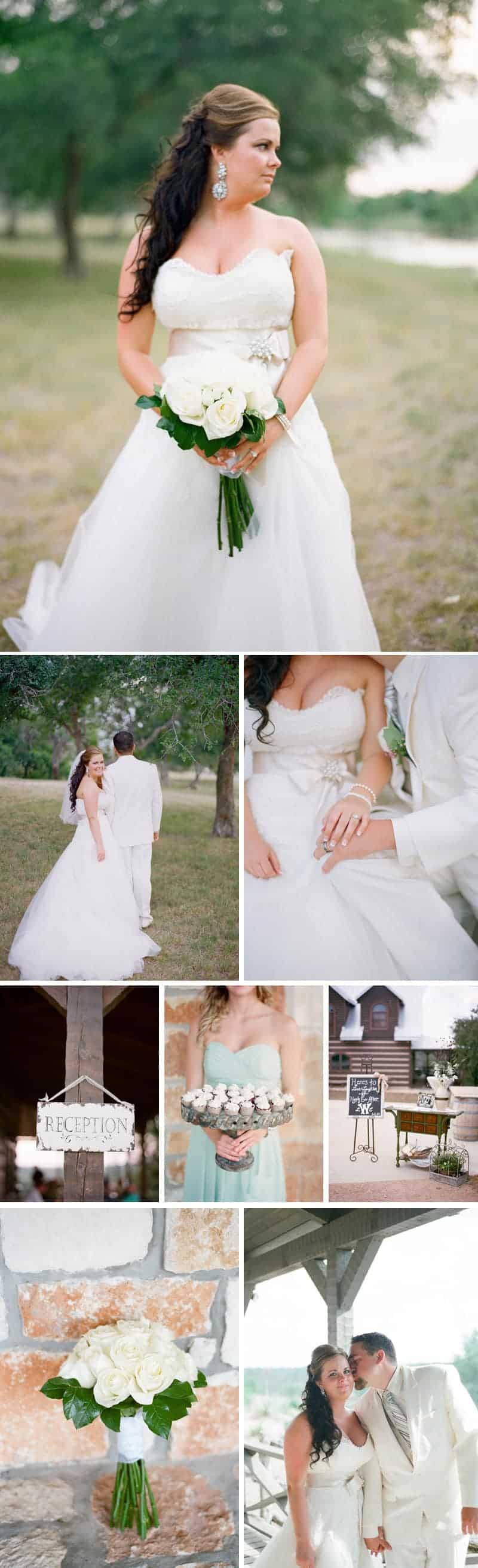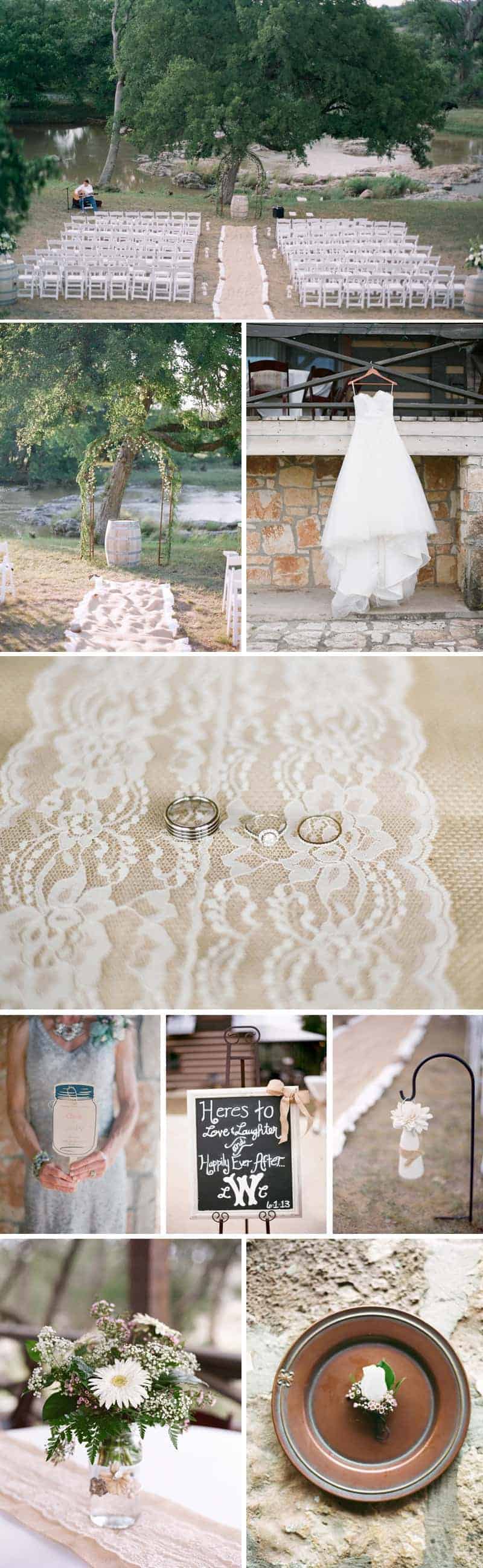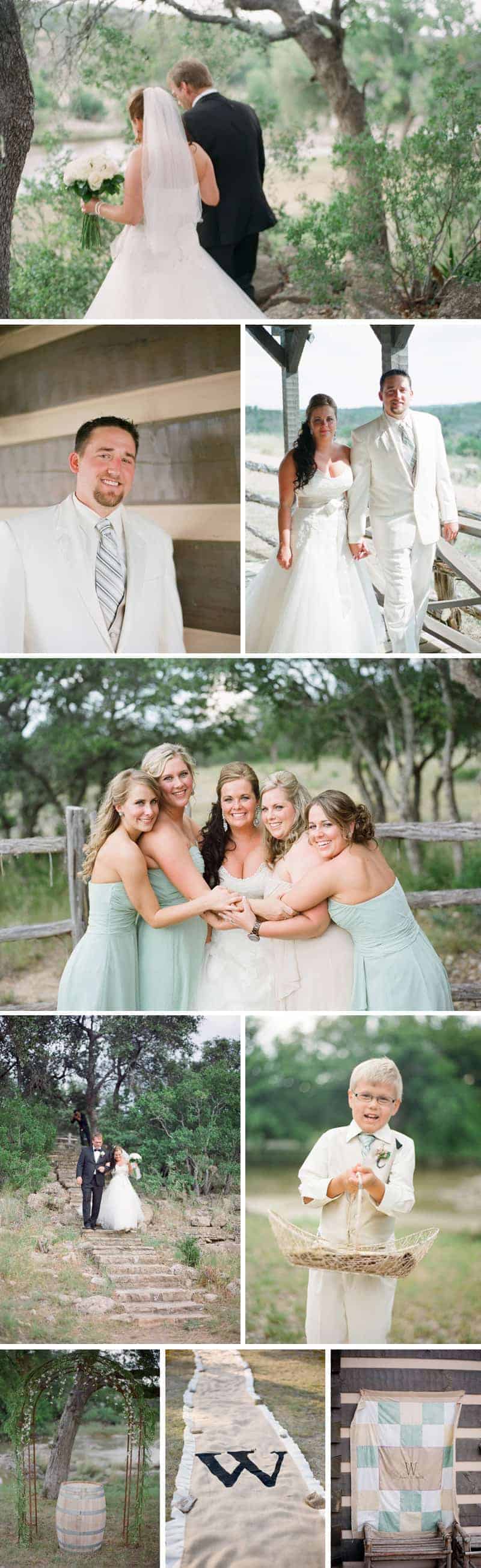 We really wanted to embrace the beauty of the outdoors and create a wedding that had the perfect mix of rustic, country and DIY. With this is mind we decided to marry at the Selah Springs Ranch in Brady, TX. The ceremony was right on the Saba river, it was so beautiful with a huge green Oak tree, the river flowing by and hills surrounding us. The lodge where we held our reception was situated on top of a hill and was lit up with lots of lights in the evening – it looked stunning!