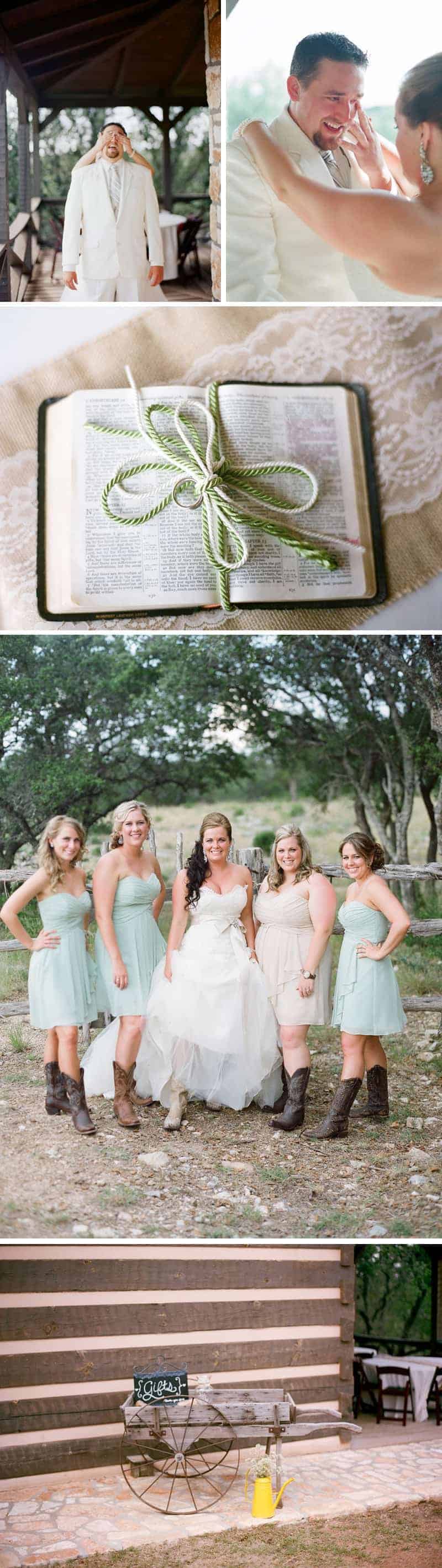 I thought I was going to find, discovering the perfect dress a bit of a mission so I prepared myself by booking multiple appointments at boutiques in Dallas, TX. I totally surprised myself however when I walked into the first boutique and came across a La Sposa dress that would be perfect for me. It was ivory and elegant and had just the right look to wear with my cowboy boots. Landry and the groomsmen wore ivory coloured suits but decided as the wedding was to be outside and was more of a relaxed affair they would go without suit jackets. The bridesmaids wore mint green strapless dresses and my maid of honour wore a champagne coloured dress which I thought tied all the wedding party together nicely.