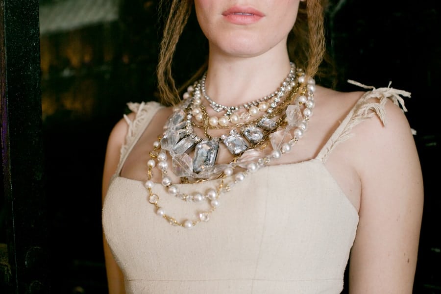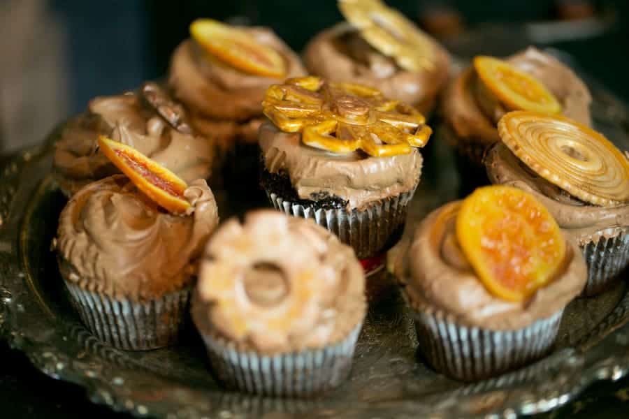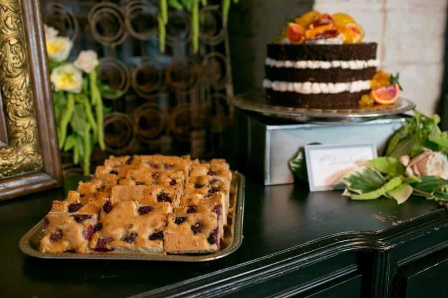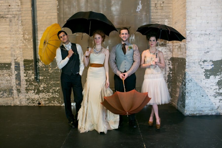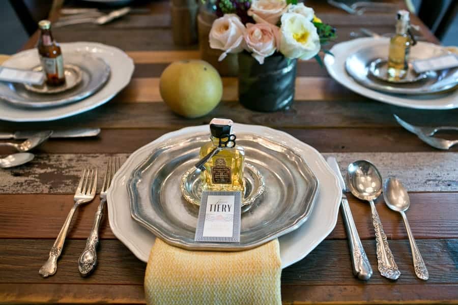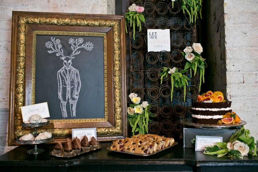 Organic and rich desserts sit sweetly atop mismatched platters surrounded by draping floral and old bedsprings adorned with tantalizing tags…let them eat cake… Whiskey poured out of timeworn decanters by our charming mustached bartender flows into heavy glass tumblers garnished with pomegranate, citrus, and sprigs of rosemary and mint. Last but certainly not least, our ceremony features a 6-foot chalkboard with an airy quote and majestic ship framed in by stacks of suitcases and more vintage trunks. Our bridal party is dressed to the nines with the ladies in ethereal gowns and dramatic make-up and the gentlemen in dapper suits and top hats.”
