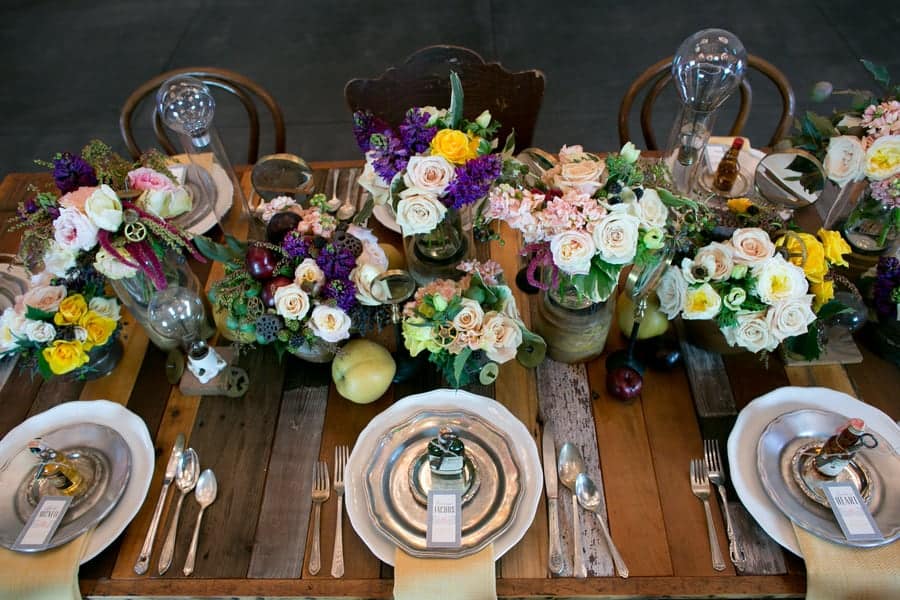 Mechanical gears, industrial light, tarnished metals, and inventive eyewear are just some of the steampunk style elements that were featured in today’s creatively styled shoot. I absolutely adore the little cog details dotted throughout too, they’re not too obvious and it just works when all topped off with a luxurious spread of mustards hues and rich browns! Epic!