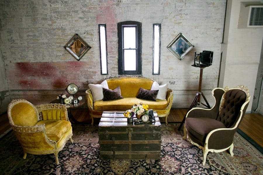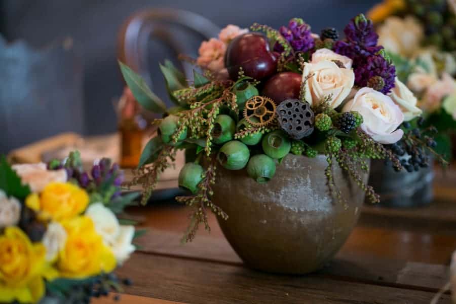 “The inspiration behind Steampunk stems from mechanical gears, industrial light, tarnished metals, and inventive eyewear all juxtaposed against a more feminine, organic and whimsical atmosphere. This shoot features 5 vignettes all designed around this theme. Our tablescape includes materials of silver, cedar, and brass softened by blush floral, succulents, mustard linen, and curious magnifying glass. The place cards are accented with miniature whiskey delights and skeleton keys. The lounge is a luxurious spread of mustards and rich browns surrounded by vintage trunks and cameras complete with elegant sofas and wingback chairs.