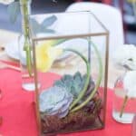 The gold geometric shapes and retro feel of the vases represents a very modern and clean look for today. Another style trend to watch is vintage place settings and other vintage inspired pieces. These are already so popular for weddings today, and were a large piece of our place settings at our styled shoot to really create a 60’s look. The colors in this styled shoot are bold which is an inspiring twist on the subtle tones that were so popular in 2014. The mod-inspired silhouette of the dresses will leave a lasting impression for today’s bride in the gorgeous gold and lace fabrics.