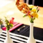 “At our ceremony, I wore my Grandmother’s wedding gloves and all 8 of our nieces and nephews tossed sprinkles (everything’s better with sprinkles, right??) down the aisle. What an entrance! We were heartbroken that we couldn’t include our 3 dogs in the ceremony, but my Mom designed custom programs that had their photos on them and our cake topper was custom made by Lollipop Workshop to look just like the 5 of us! Seriously, the cutest thing ever! Jeff and I met at a Breakfast-For-Dinner party, so naturally we served Breakfast-for-Dinner at the reception and gave our guests small bottles of Zing Zang bloody mary mix as favors.”