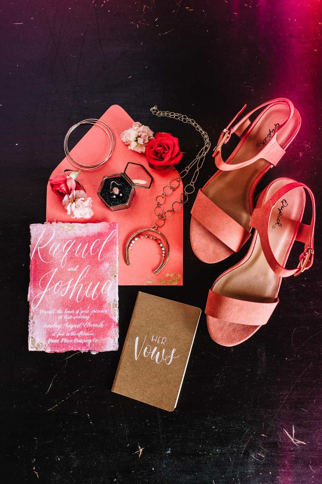 “An invitation suite and vow books were handmade by Emily Olsen of Dirty Hands Clean Soul Creations. The suite was done in various shades of coral and showcased beautiful calligraphy in white with touches of gold leaf. The vow books were a lovely addition for Joshua and Raquel’s marriage reflection.”