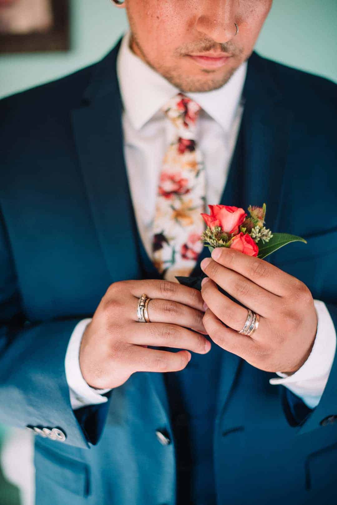 “Both Joshua and Raquel wore handmade jewelry designed by L2 Creations. Raquel wore a beautiful gold ring stack as her wedding and engagement set, which featured a vintage, hand carved coral cabochon stone as the focal point. She also wore a gold statement necklace with matching earrings featuring opals and coral, all complementing her look as a whole. Joshua wore a stacked ring set in sterling silver and rose gold to pick up the coral elements throughout the photo shoot. Each featured piece was created specifically for the Living Coral theme with other accent pieces carefully selected.”