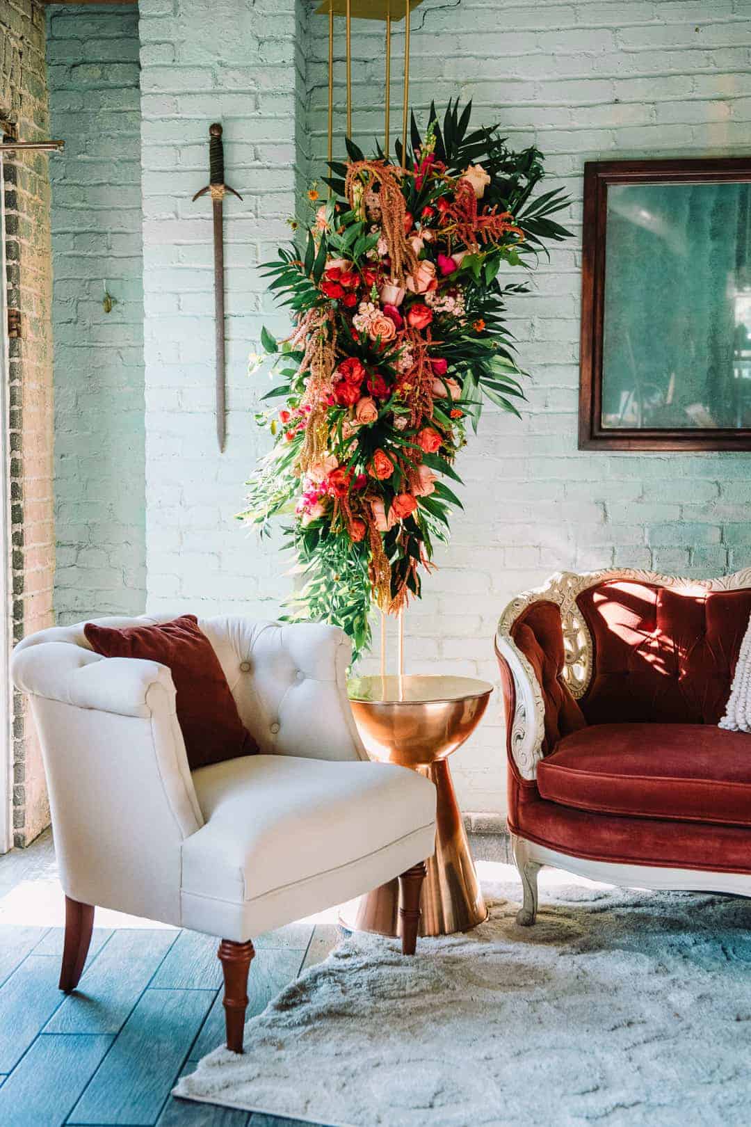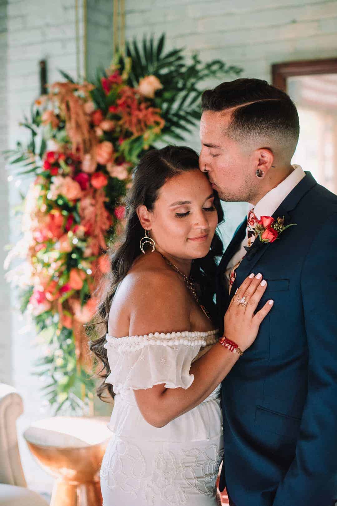 “Fox and Finch Vintage Rentals provided the perfect lounge vignette and ceremony site accents to give the photo shoot a touch of bohemian vintage vibe. The brilliant floral arrangements were created by Allium Floral Design. Allium artists put together a stunning bouquet for Raquel, a boutonniere for Joshua and an amazing freestanding, moveable floral arrangement that was utilized in both the lounge vignette and ceremony site. Whilst, Julie Cassidy of Storied Celebrations made an appearance as our Celebrant for the day, bringing Josh and Raquel together for a marriage reflection ceremony. She read a beautiful poem by Rupi Kaur and led Josh and Raquel through a vow and ring exchange that had us all feeling emotional behind the scenes. Here is an excerpt “…and I promise you that love will be just as beautiful if you’re in a thousand pieces or just one.” – Rupi Kaur. Can you blame us for feeling all the feels?”