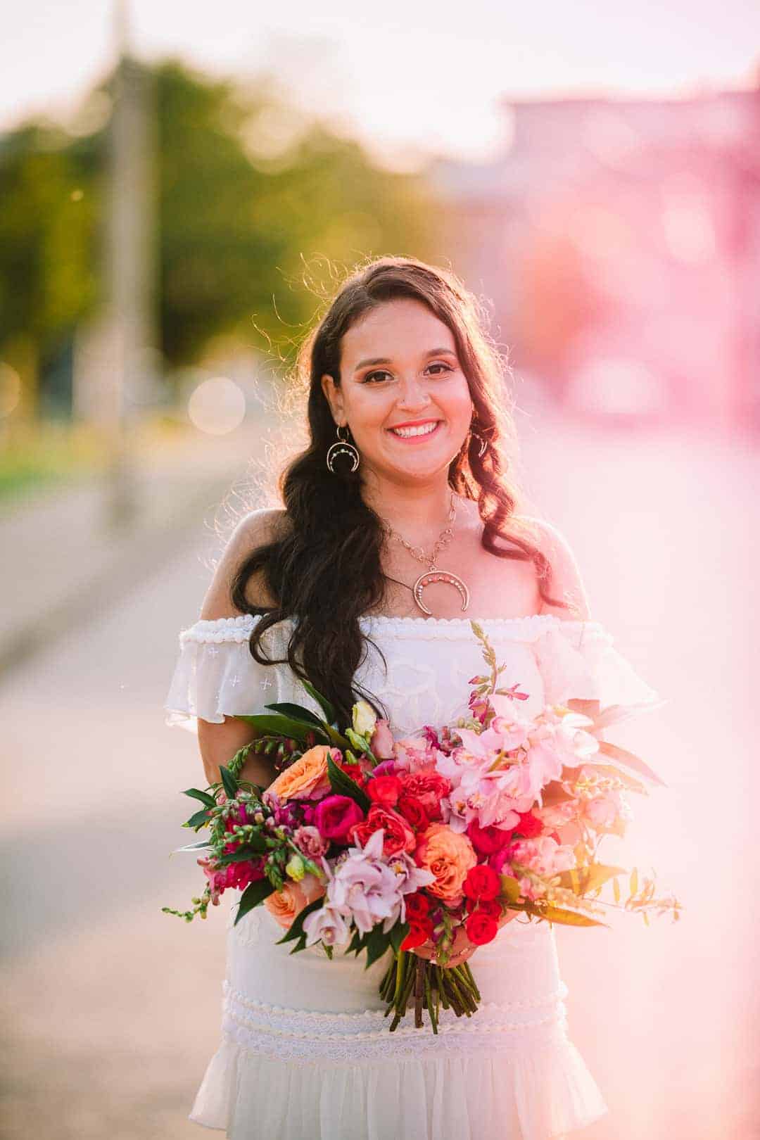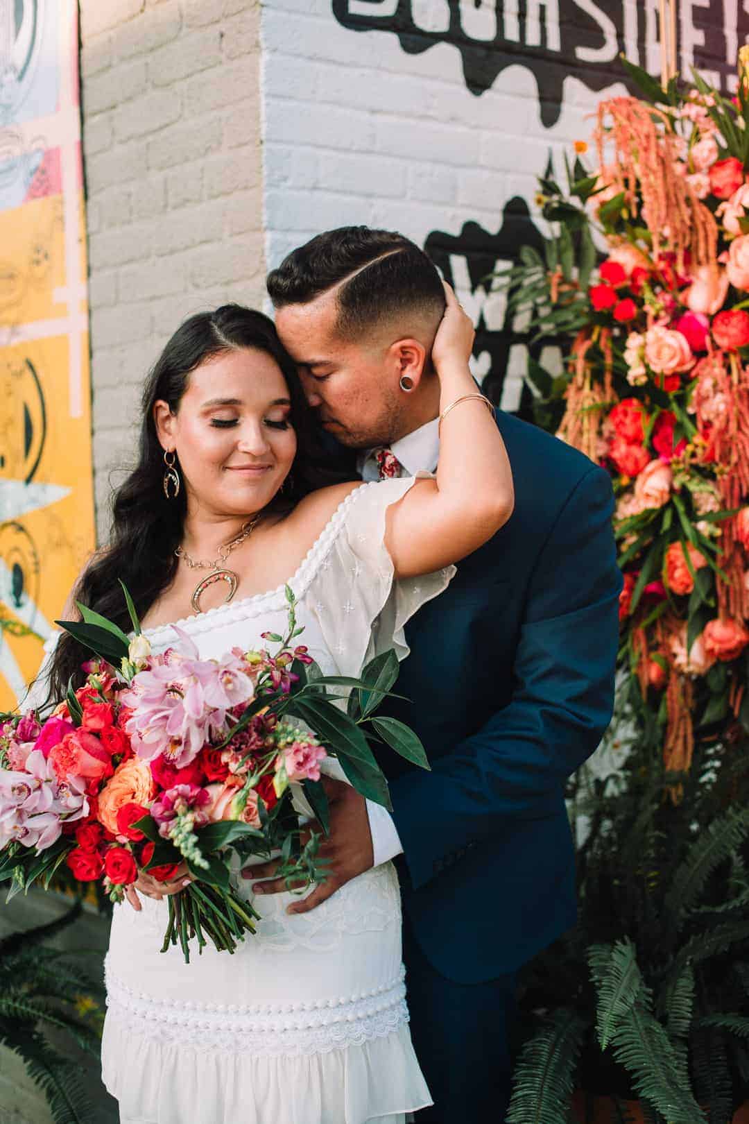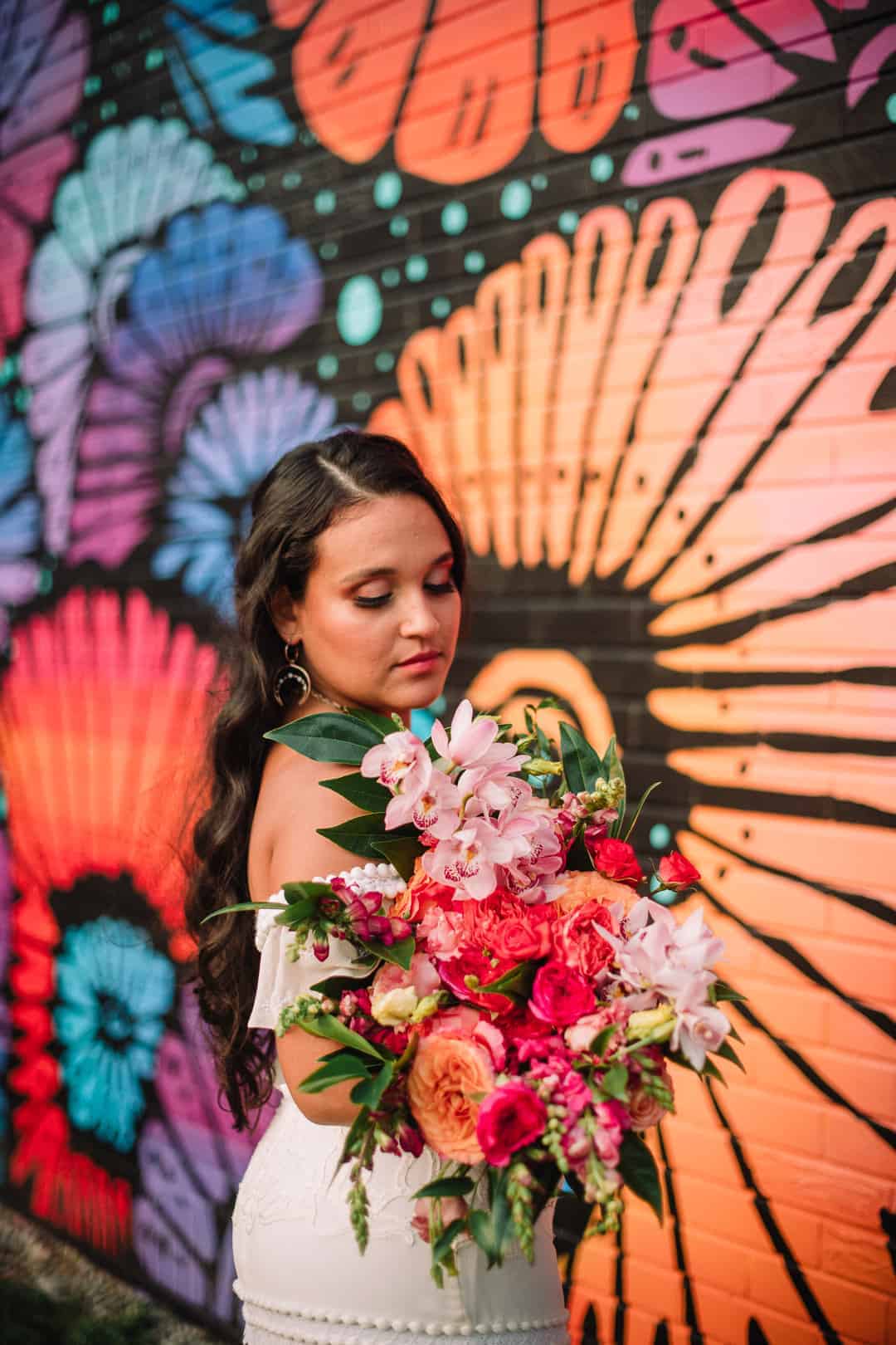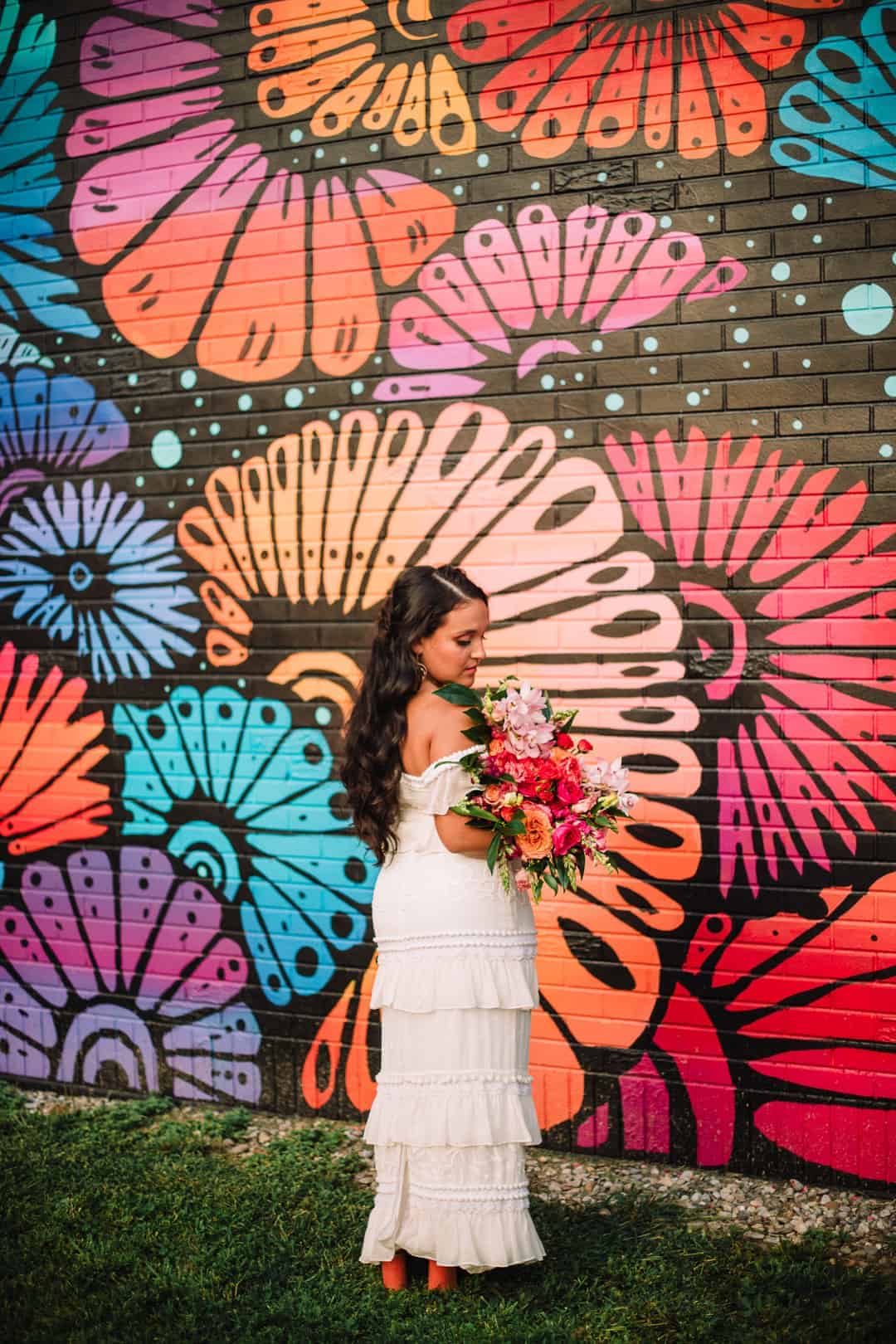 “Bonn Place Brewing Co. provided the perfect micro vow renewal setting, featuring murals by artists Amy Perdue as well as Denton Burrows of Dripped on the Road. Our secondary portrait location featured another colorful mural on the exterior wall of local establishment – Cafe the Lodge – done by an artist known as The Art of Pau. Each mural backdrop tied in beautifully with this shoot’s vivid theme.” Christina added.