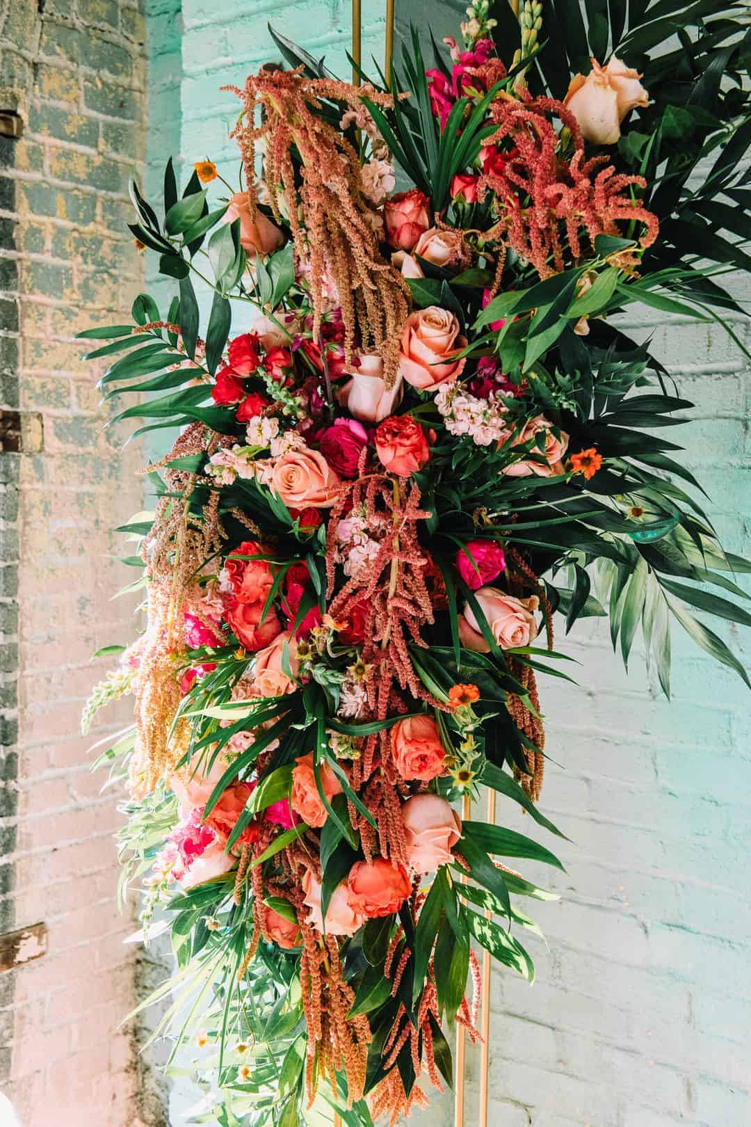 “We wanted to feature the Pantone color of the year, Living Coral. Shades of coral paired beautifully with blue, green and copper accents reminiscent of the aging monolith Bethlehem Steel, situated near the venue. Our couple has Puerto Rican Roots, so it was also important to honor their culture by showcasing Latino elements and utilizing the Southside Bethlehem neighborhood as the backdrop.”