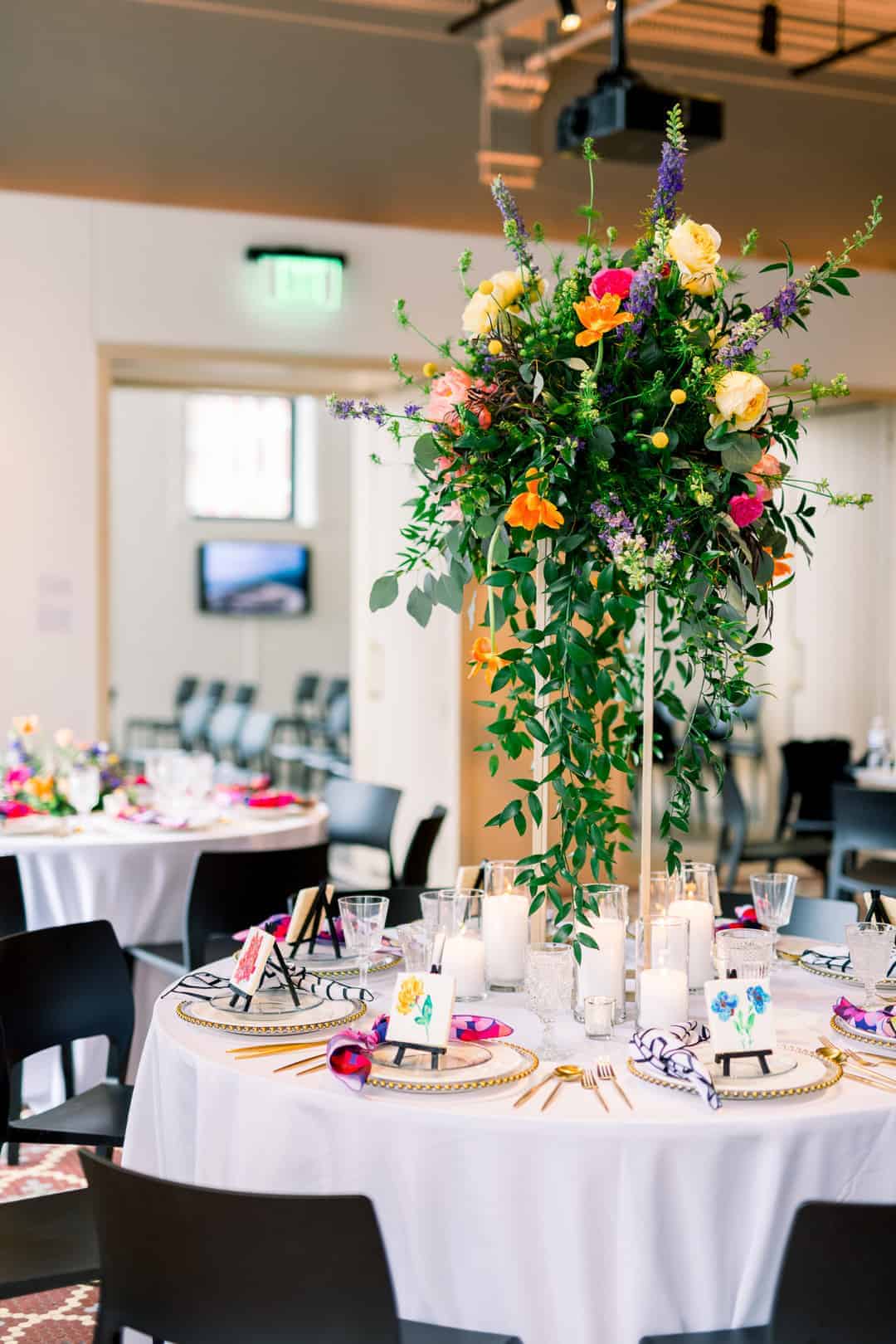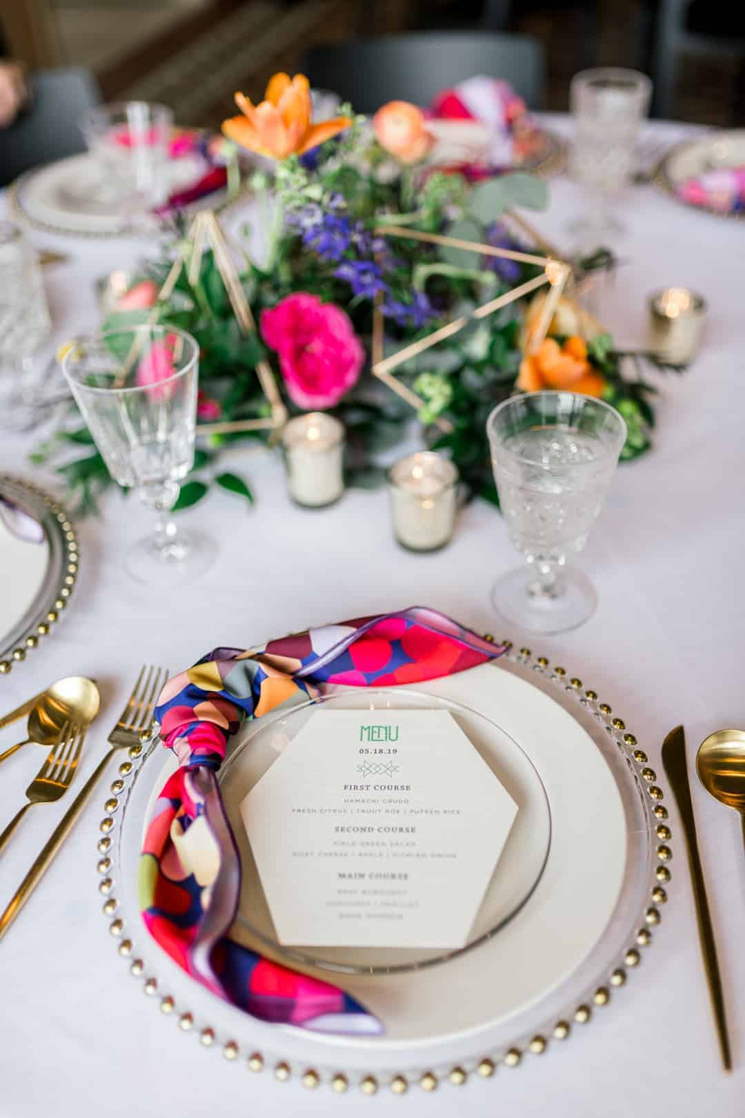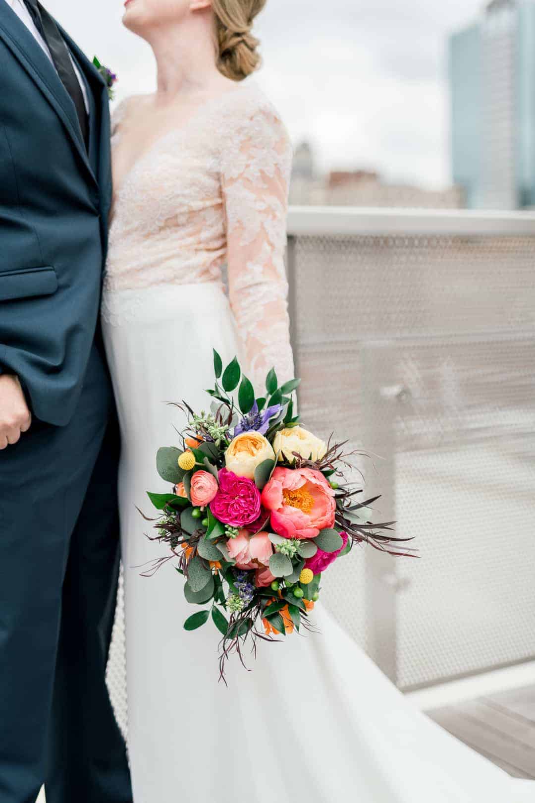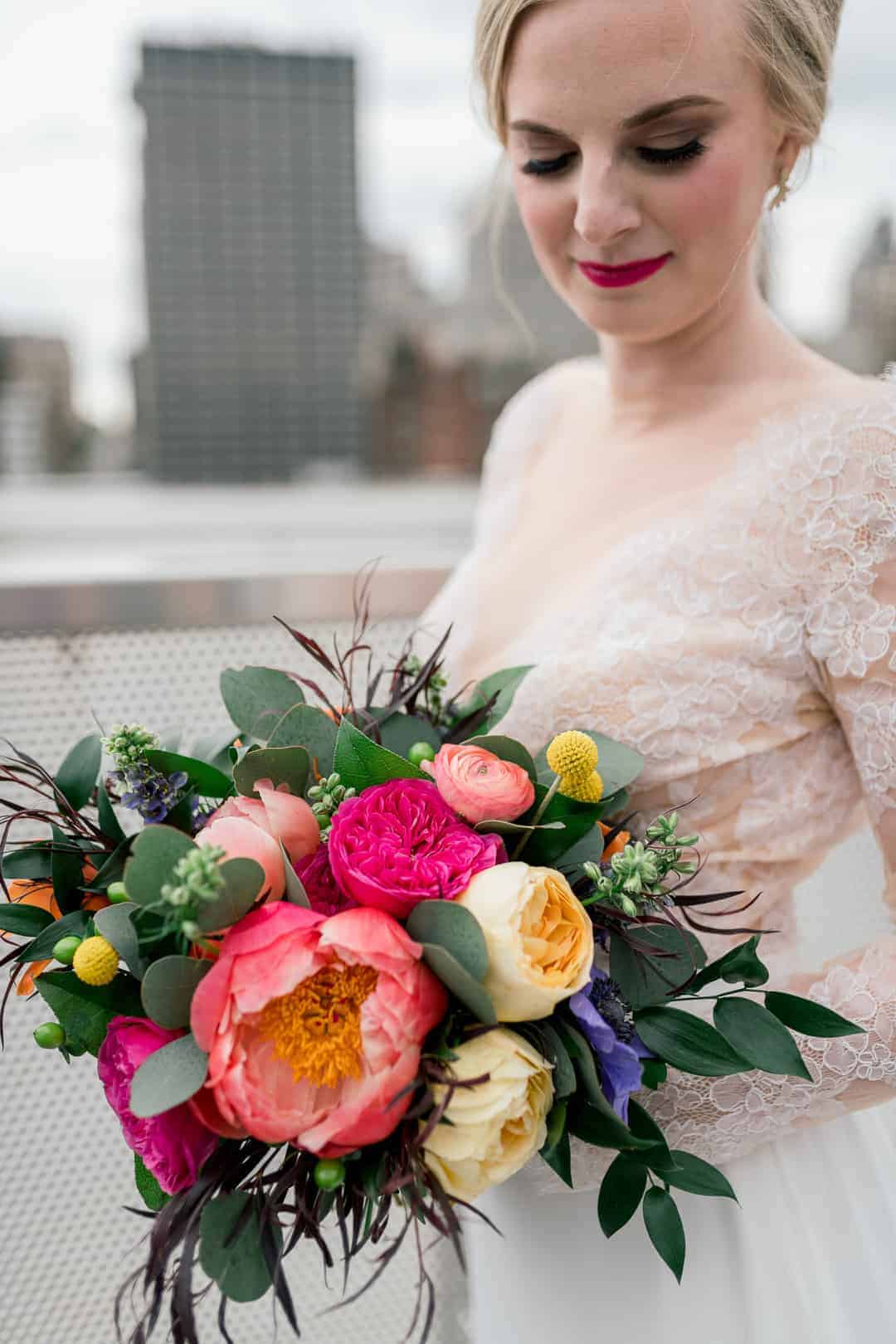 “For our Love is an Art Styled shoot we wanted major pops of color in an otherwise concrete jungle. Bright pink peonies were the star of the floral arrangements and the color palette evolved from there. The florals were the first element we designed and the cornerstone of our shoot. All other elements of the shoot honored the color palette while staying true to the Art theme.”