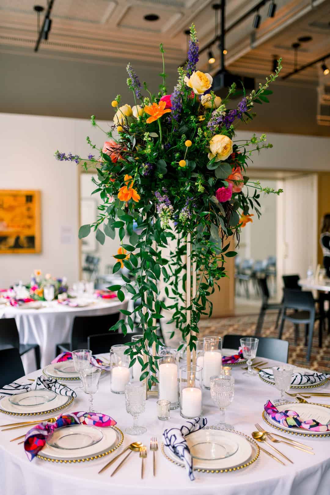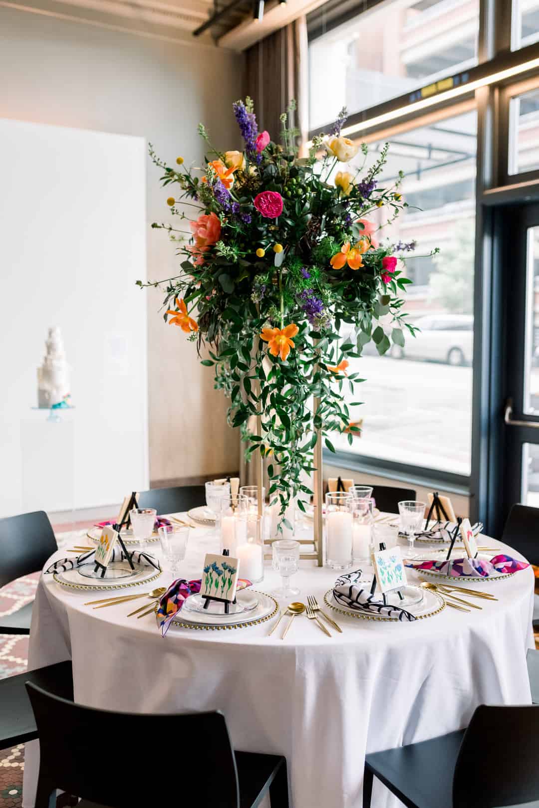 Although there is no shortage of wedding inspiration to be found here, today’s styled shoot stands out for several reasons. Inspired by bright colours, the urban landscape and art, today’s “Love is an Art” wedding inspo was created at the iconic 21c Museum Hotel, a contemporary art museum, full of vivid, multicolored art that offers guests a welcome change from the concrete jungle of Kansas City. Featuring lush florals, an historic cocktail lounge and the beautiful city in the background, these wedding ideas will inspire you to create a wedding style that is fun and full of personality.