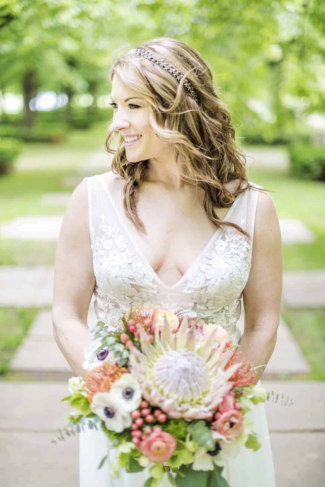 Dan Meiners is a genius designer. We were lucky that we had floral and event design all under one roof with our venue – including flowers, decor, furniture options, etc. During the planning process, I put together a mood board for Dan. The best way to describe it was sort of a palm desert, modern, topical, glam, boho vibe. We wanted our space to look different than other weddings. Have the space look fun, approachable, and interesting. We wanted it to be a tad bit eclectic but not look messy.” She added.