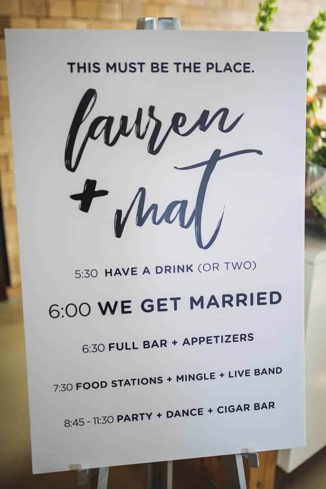 “The food stations consisted of a street taco stand, build-your-own Mac and Cheese bar, and a Buffalo Wing and Condiment station featuring all of our favorite condiments from around the city and the dipping mechanisms to get them into our bellies (tots, chicken strips, waffle fries and buffalo wings). The food stations stayed up for 1.5 hours so that people could eat at their own leisure, we really wanted to avoid the down-time of a formal dinner hour that would kill everyone’s energy and put people in a food coma. During this time the band played relaxed-funky music and during their break we did our speeches, after which Mat’s cigar bar was revealed on the venue’s patio and we brought out an assortment of mini bite-size cakes and cookies (in addition to a small tiered cake so we could have a cake for a photo op).The band returned for several more hours of dancing, we brought out light-up neon foam sticks to dance with and it was all culminated with bringing in Chick-fil-A sandwiches for the late night snack!We tried to put our own twist on everything we did.”