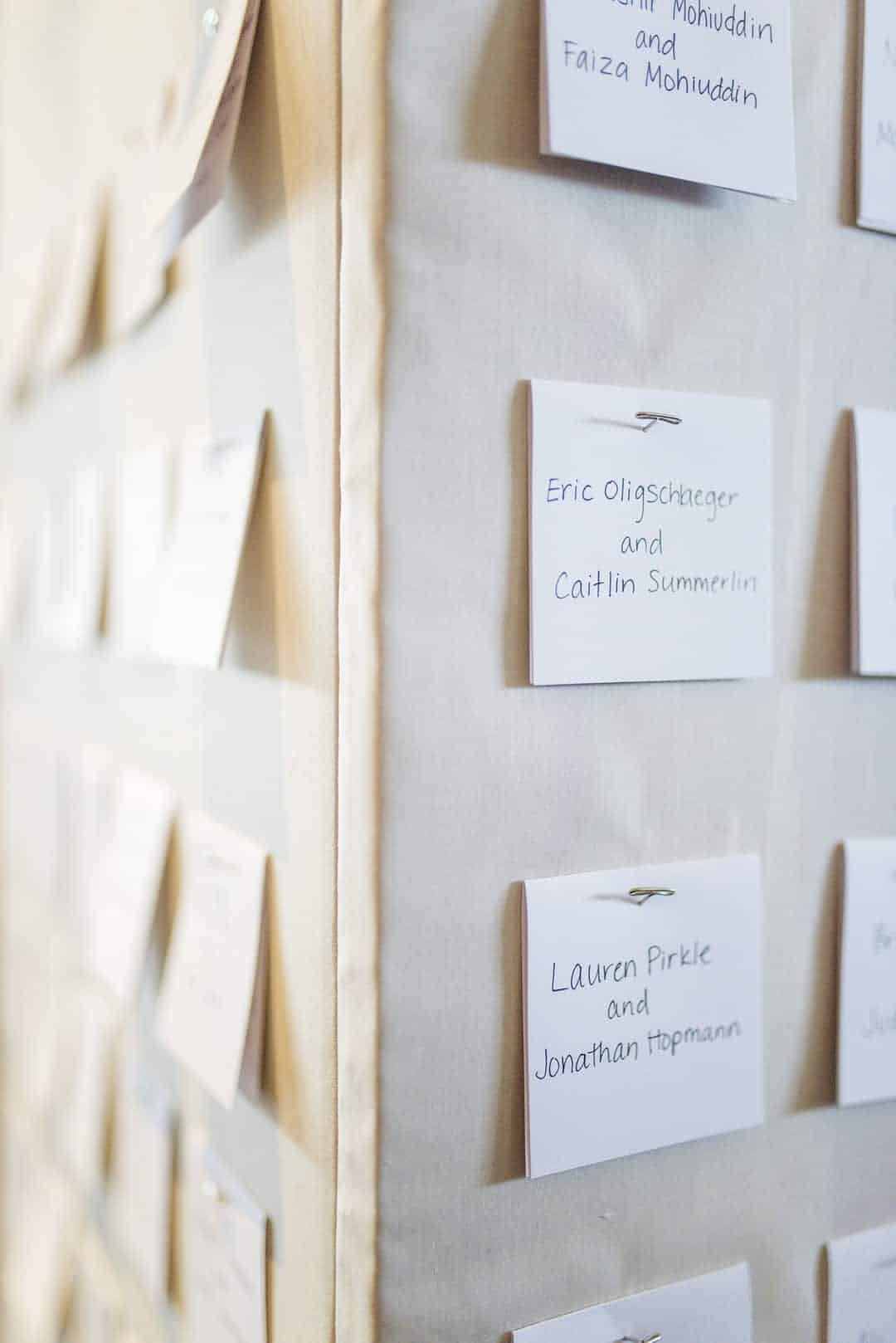 “Since formal pictures were already done, we were able to enjoy our own cocktail hour and hang out with our guests, giving hugs and welcoming them. We also made sure to direct everyone to a wall near the entrance that had named cards for each guest pinned on them. These cards served as our “Seat assignments”. I put that in quotes because nobody had seat assignments but we needed an effective was to communicate that to our guests. Instead, each card directed our guests to mix and mingle with the other important people in our lives and also featured a handwritten memory, inside joke or other short message to highlight why that person, specifically, was important to us. This helped serve as a personal touch to each guest so to ease the pressure on us to small talk everyone, but it also provided an ice-breaker and conversation starter for our other friends who may not have met yet. It also communicated that even without assigned seats, this was meant to be a free flowing party event, not an event where everyone had to be seated at once. They could enjoy the bar, food stations, dancing and company of other guests in a more mix and mingle format.”