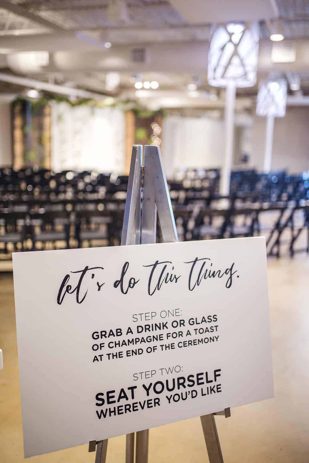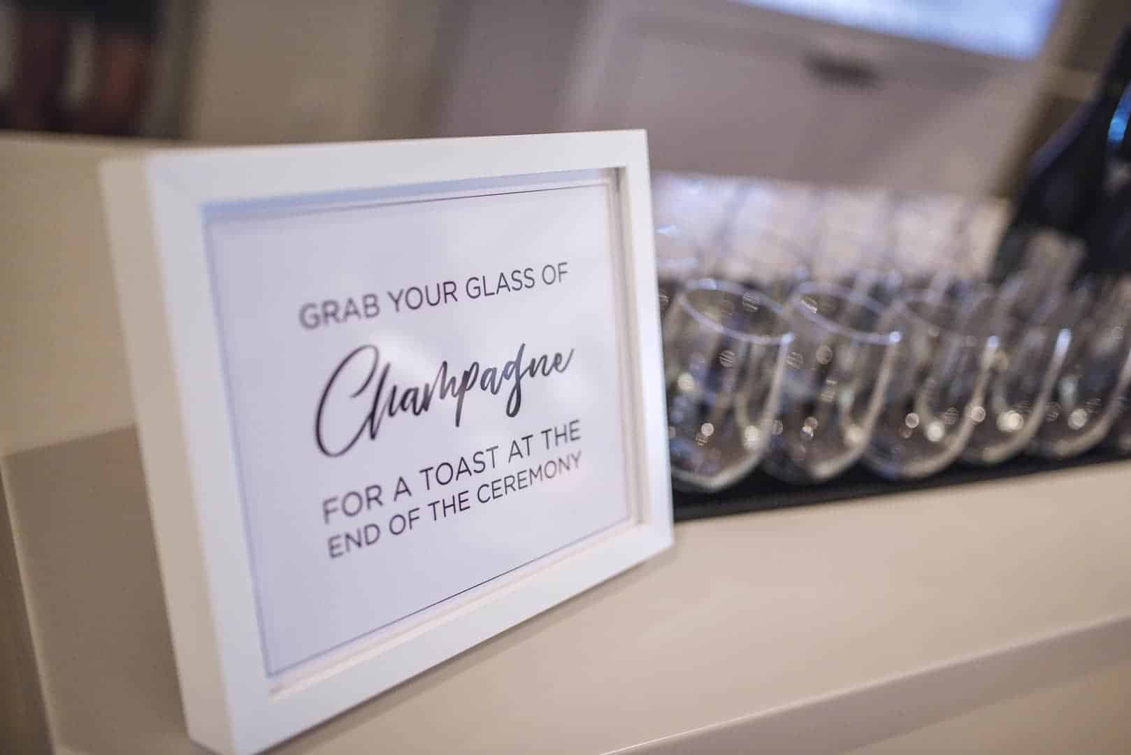 “After 30 minutes to warm up, the guests were directed into the main room of the venue for the ceremony to begin. No assigned seats and no “sides”, everyone could sit where they felt comfortable. This helped to keep the light and informal attitude. There was a champagne station as you walked into the ceremony with a sign that said ‘Grab a glass of champagne for a toast at the end of the ceremony.’