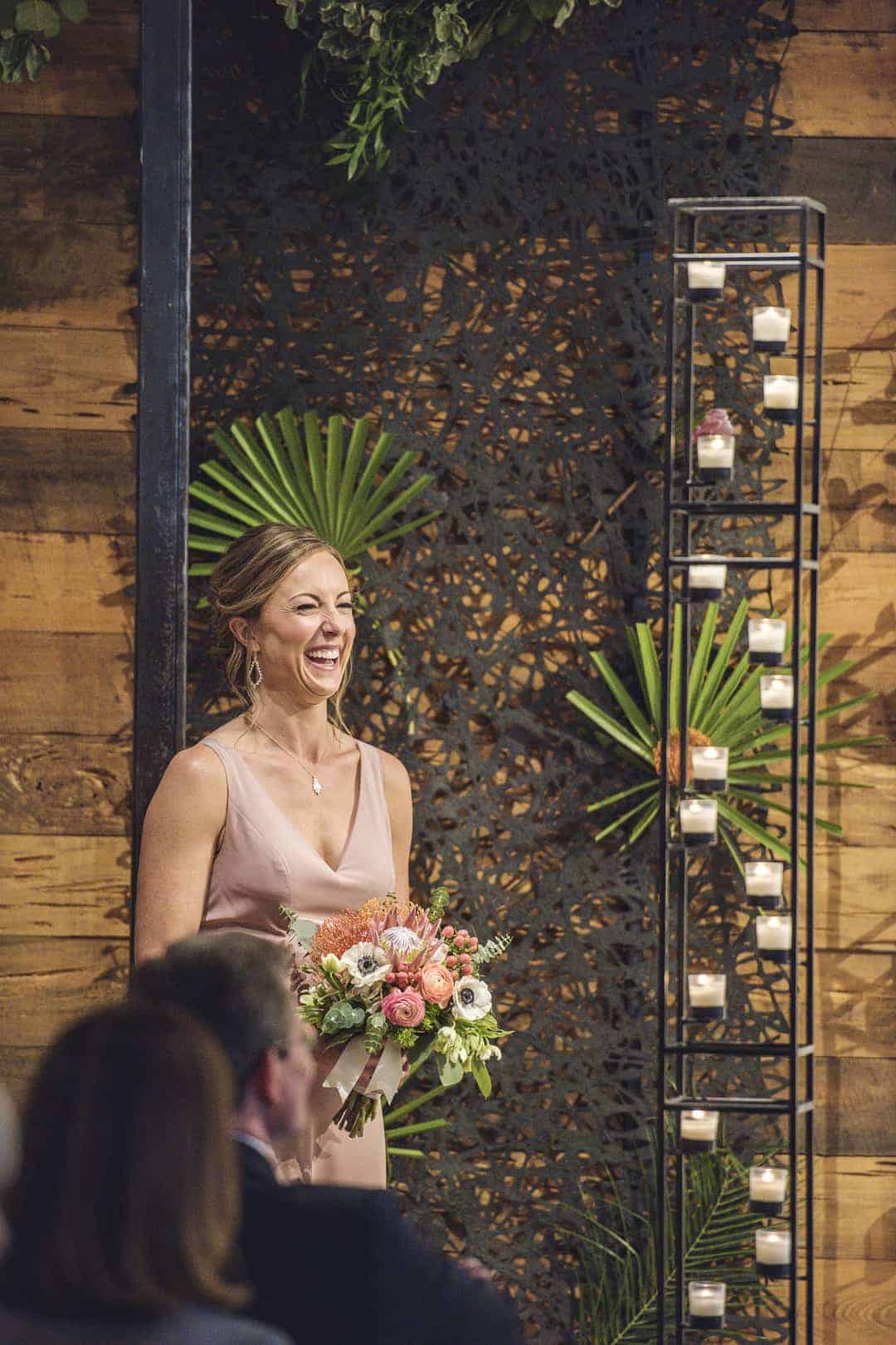 “The wedding took place at a hip urban venue in downtown Kansas City, the workshop and event space of a renowned event designer and floral artist. Upon arrival, all guests were greeted to an open bar, vibey lounge music and the go ahead to get the party started. We really wanted to start high energy and keep it there, we’ve all been to weddings where we weren’t sure when to let loose, where we felt we had to remain quiet and polite for the first portion until the real fun began, we tried to quash that right out of the gates.While the bride was in the back room getting ready, the groom was out front handing out drinks and welcoming people into the event helping to set the expectation that cocktails were available and that everyone should have one in the ceremony, with at least a bit left at the end for a toast.”