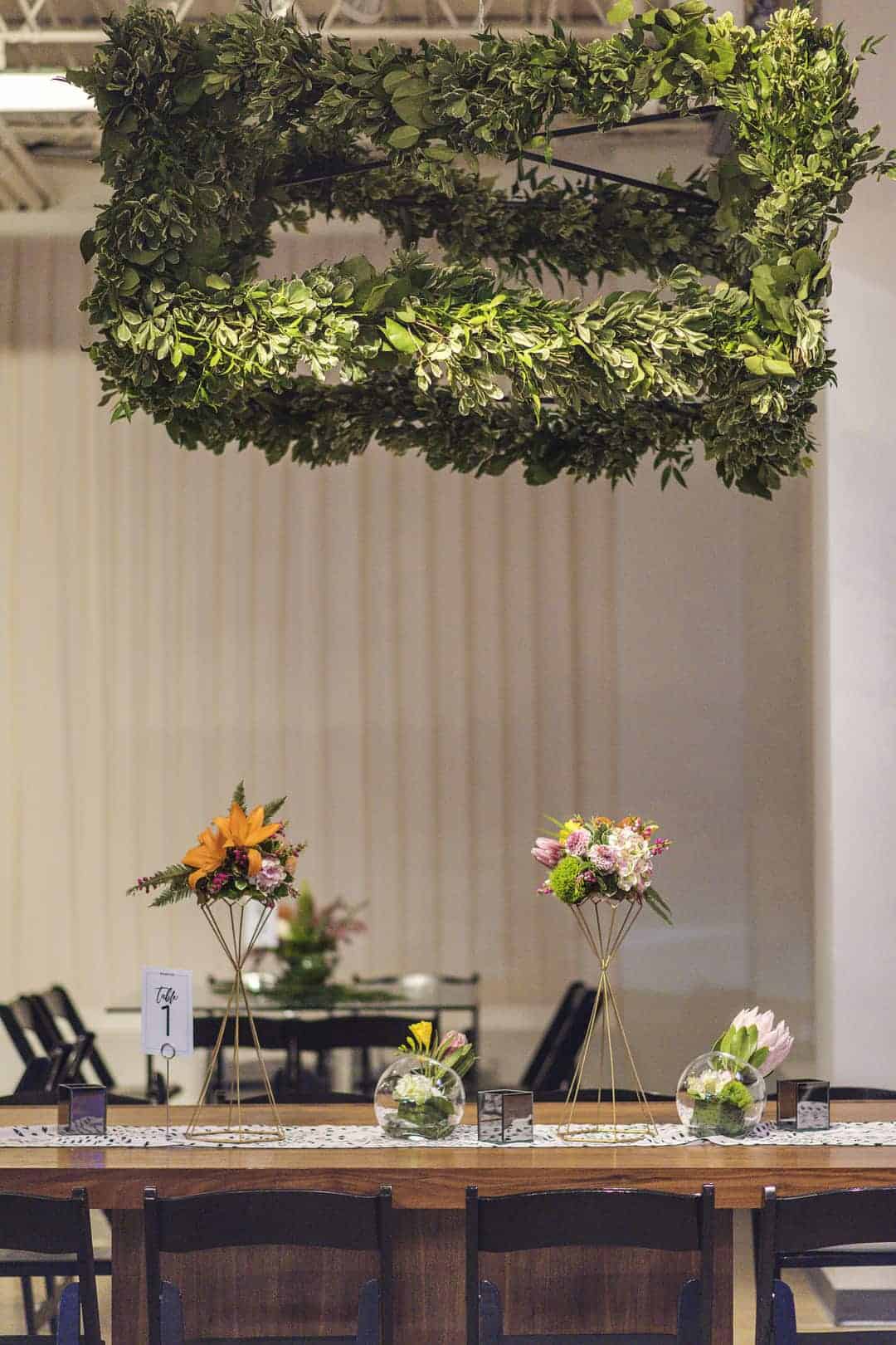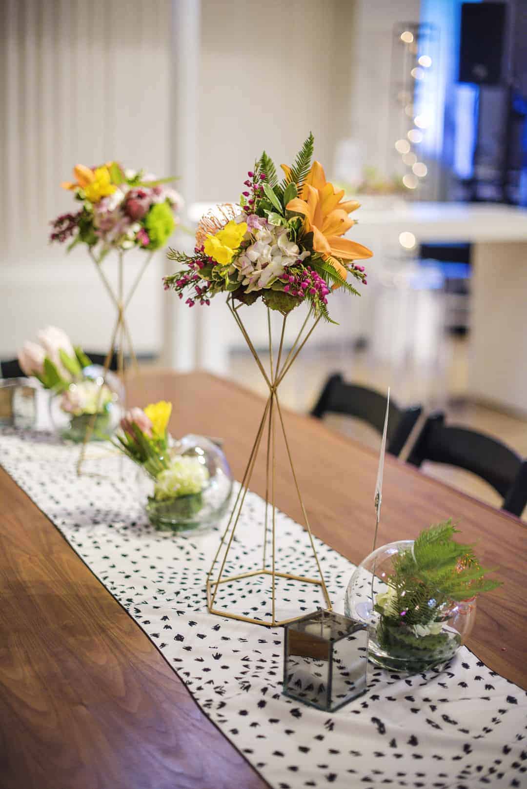 “After the ceremony, we transitioned this wall into our “photo wall” and added a hot pink neon Electric Love sign on it. This became a focal point of the decor as the room transformed for the reception. The ceremony backdrop also included tall, dark metal candle towers, a small stage for the officiant, bride and groom, and large tropical greenery draped across the top. We mixed and matched different styles of tables for a more eclectic look and to help with the flow of the event. We had large wood tables that fit 12 people, square glass tables that sat 8, long high top tables that sat 6, and standing cocktail tables throughout the space. And eclectic mix of tropical flowers in different sizes and containers sprinkled the table tops. Some arrangements sat upon tall, gold, geometric vases. Others were single flowers in shorter round glass bubbles. Others were in small rectangular smoky mirror vases. We also placed black and white table runners on the large wooden tables – they were by a local company, Citrus and Sage, and helped infuse the tribal boho element throughout the room. Seriously, their linens have the cutest patterns! We created several lounge spaces throughout the room for the reception which included white couches, poufs, black rugs, throw pillows. One of the main lounge areas had glass bubbles hanging from the ceiling filled with tea lights. We also used signage as part of our decor element. The copy was fun and quiche which helped set the tone for the event. We had three food stations for dinner and wrapped signage around tall square metal towers that sat on each table. This helped guests know what food was being served at the food station. We also placed signs at the champagne station, dessert table, appetizer station, tabletops, welcome sign, ceremony entry, and the photo wall. Truthfully, there were so many decor elements already built into the space that made it easy to just add a few touches here and there, mixed with some florals, to easily create a space that looked really nicely decorated.”